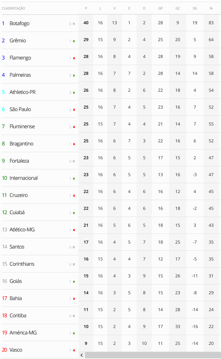 A 1 jogo do fim da 16ª rodada do Campeonato Brasileiro, o Vasco, que perdeu para o Athletico-PR por 2 a 0, caiu da 19ª (penúltima) para a 20ª (última) colocação. O Vasco tem um jogo a menos do que a maioria dos demais participantes, pois teve sua partida contra o América-MG, pela 15ª rodada, adiado.