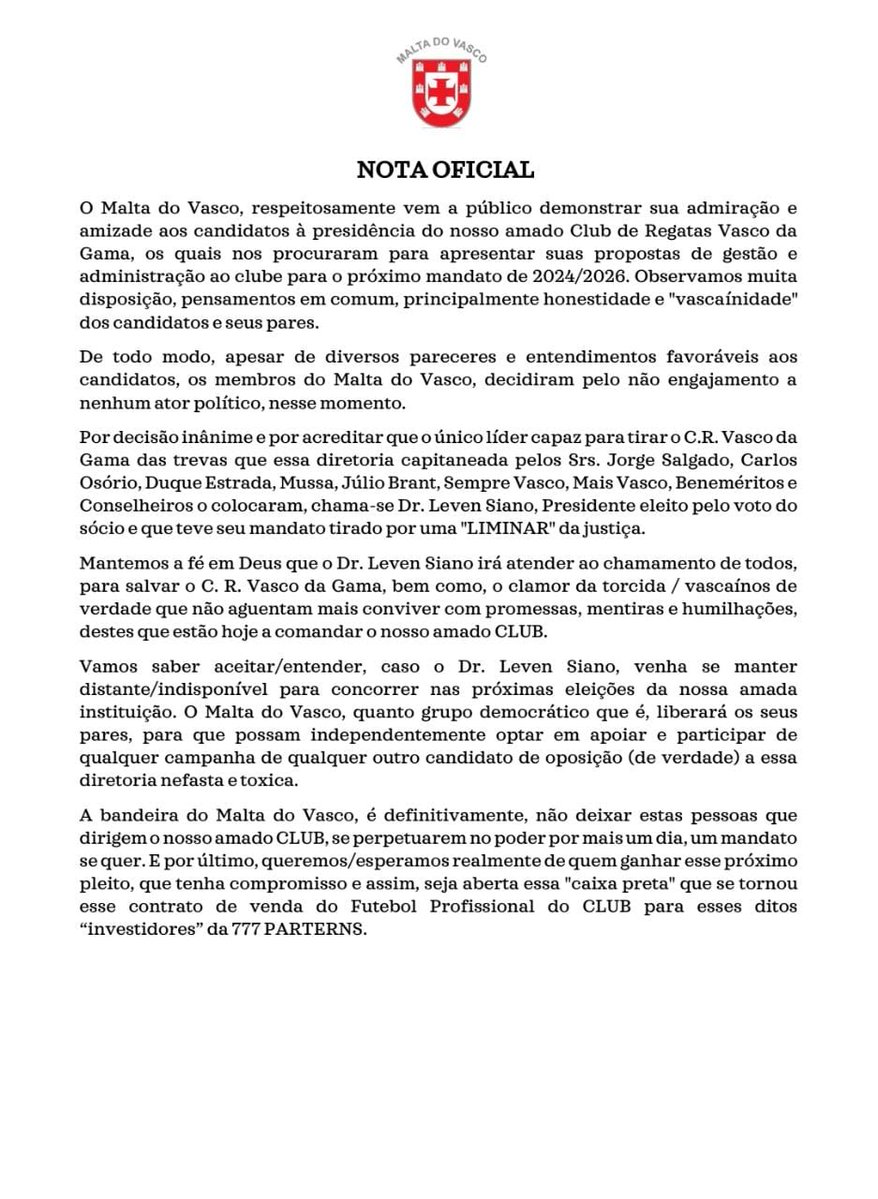 Esse é o posicionamento oficial do Malta do Vasco, para as próximas eleições, que vão ocorrer em Nov/2023!