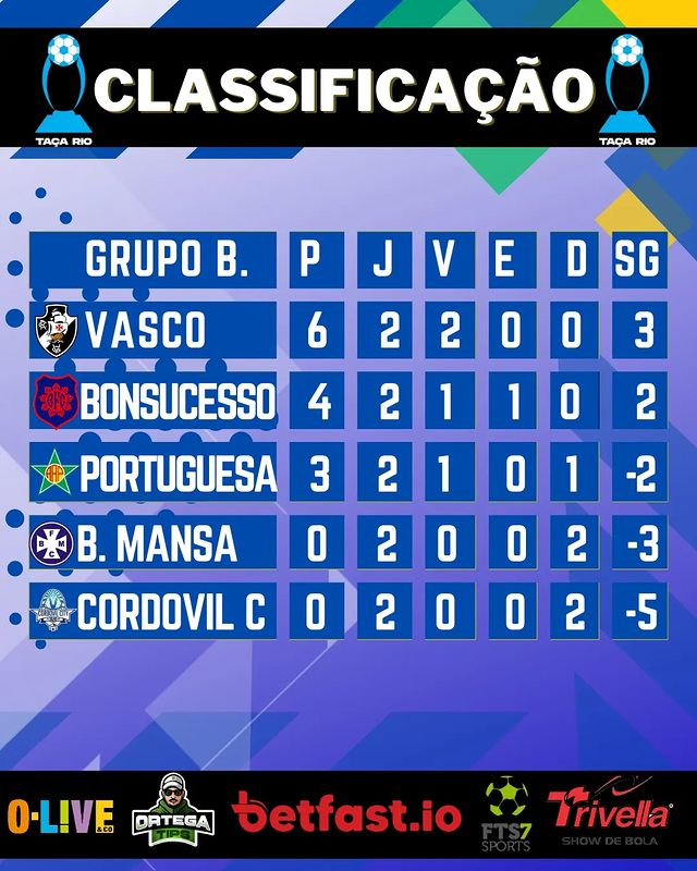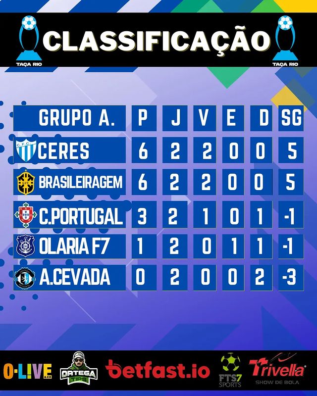 Classificação atualizada da Taça Rio @betfast.io após a segunda rodada.
