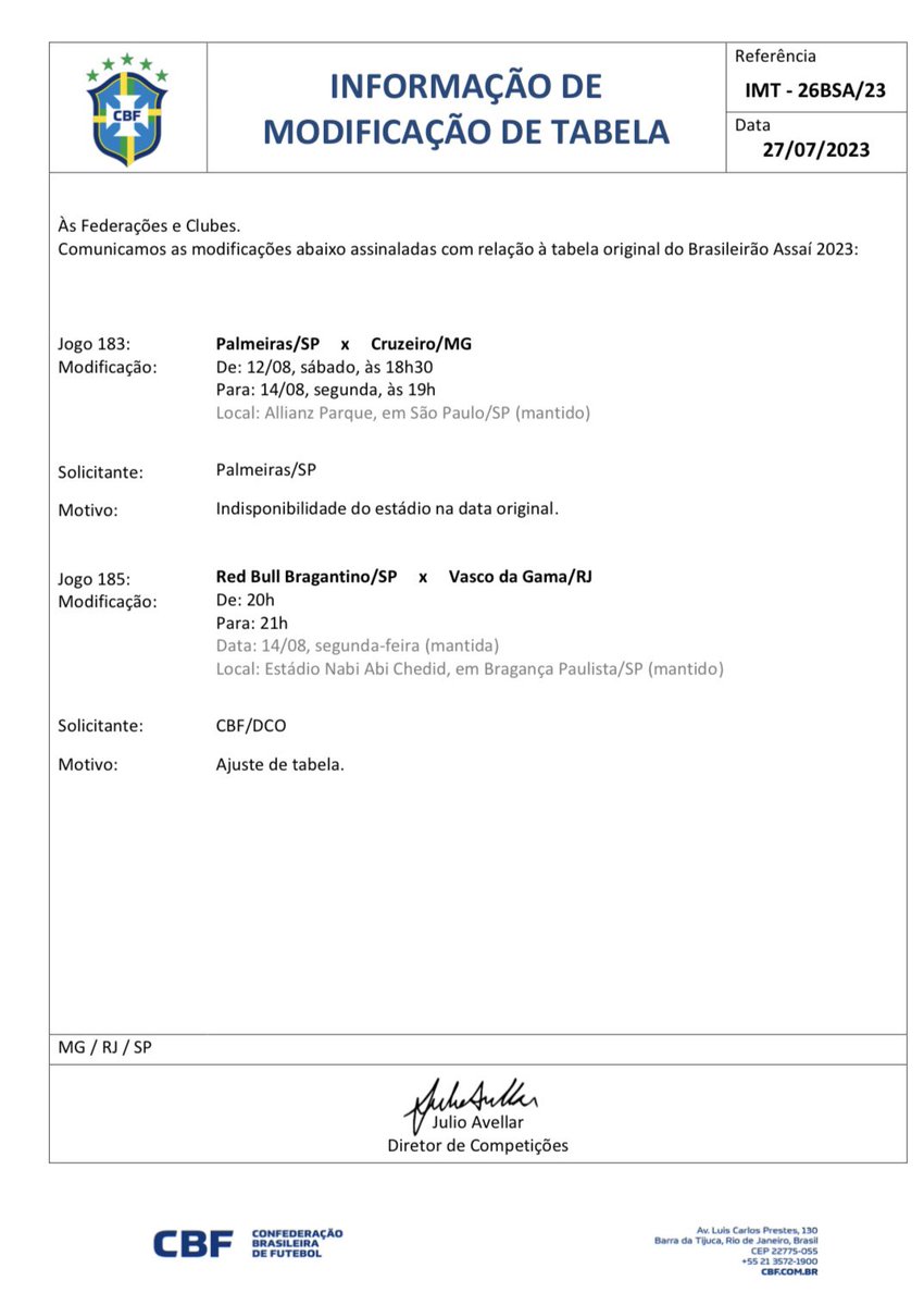 CBF muda horário de Bragantino x Vasco, no dia 14/08, das 20h para as 21h