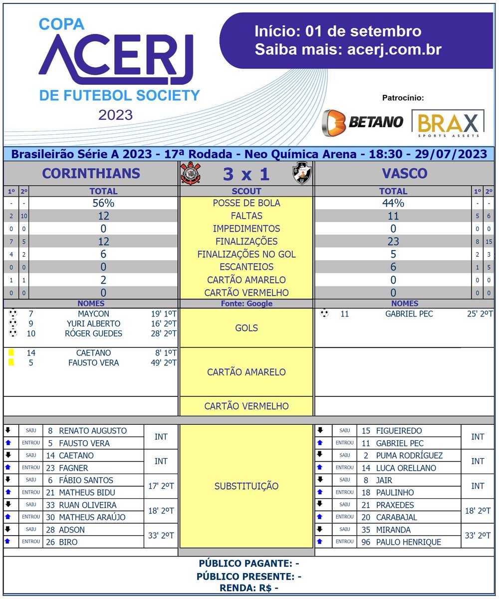 Scout Final de Corinthians e Vasco pela 17ª Rodada do Campeonato Brasileiro 2023 na Neo Química Arena (Fonte: Google) #Acerjinforma #Brasileirao #SCCPxVAS #Corinthians #Vasco @Brasileirao @corinthians @VascodaGama