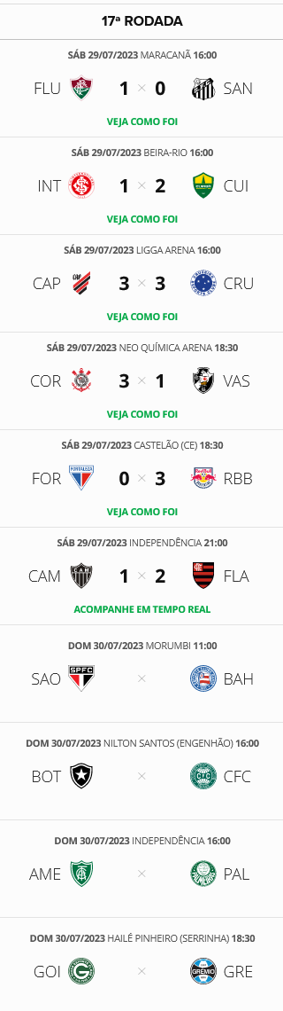 Após os jogos deste sábado pela 17ª rodada do Campeonato Brasileiro, o Vasco, que perdeu para o Corinthians por 3 a 1, segue na última colocação. O Vasco tem um jogo a menos do que a maioria dos participantes, pois seu jogo contra o América-MG foi adiado.