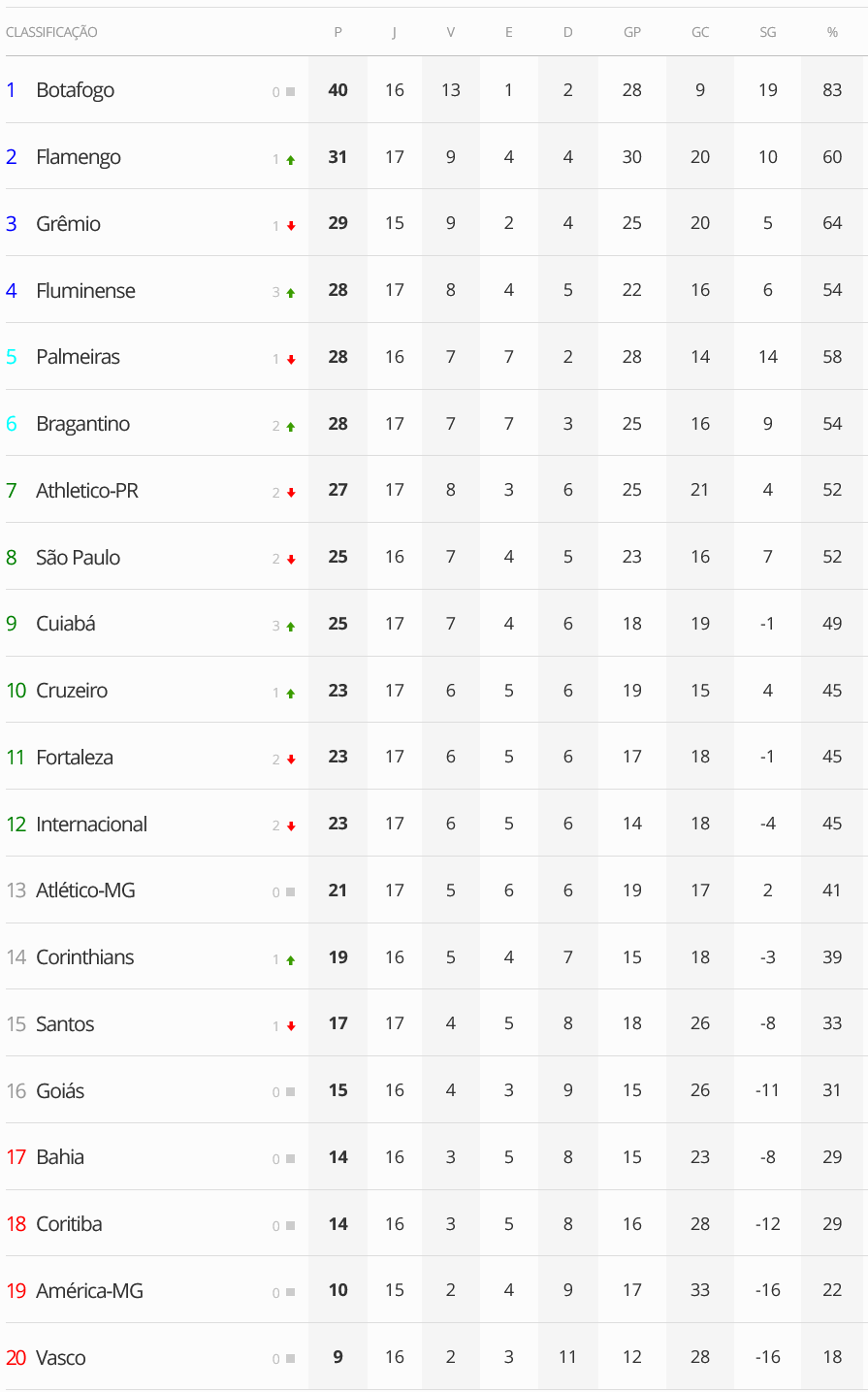 Veja a classificação do Brasileiro após os jogos de sábado; Vasco está na última colocação