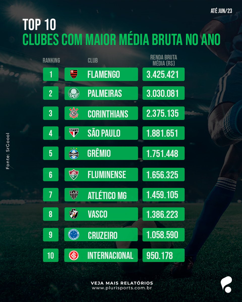 Flamengo e Palmeiras com média de renda anual superior a R$3 milhões. Atualmente temos nove clubes com valores médios acima de R$1 milhão na temporada.