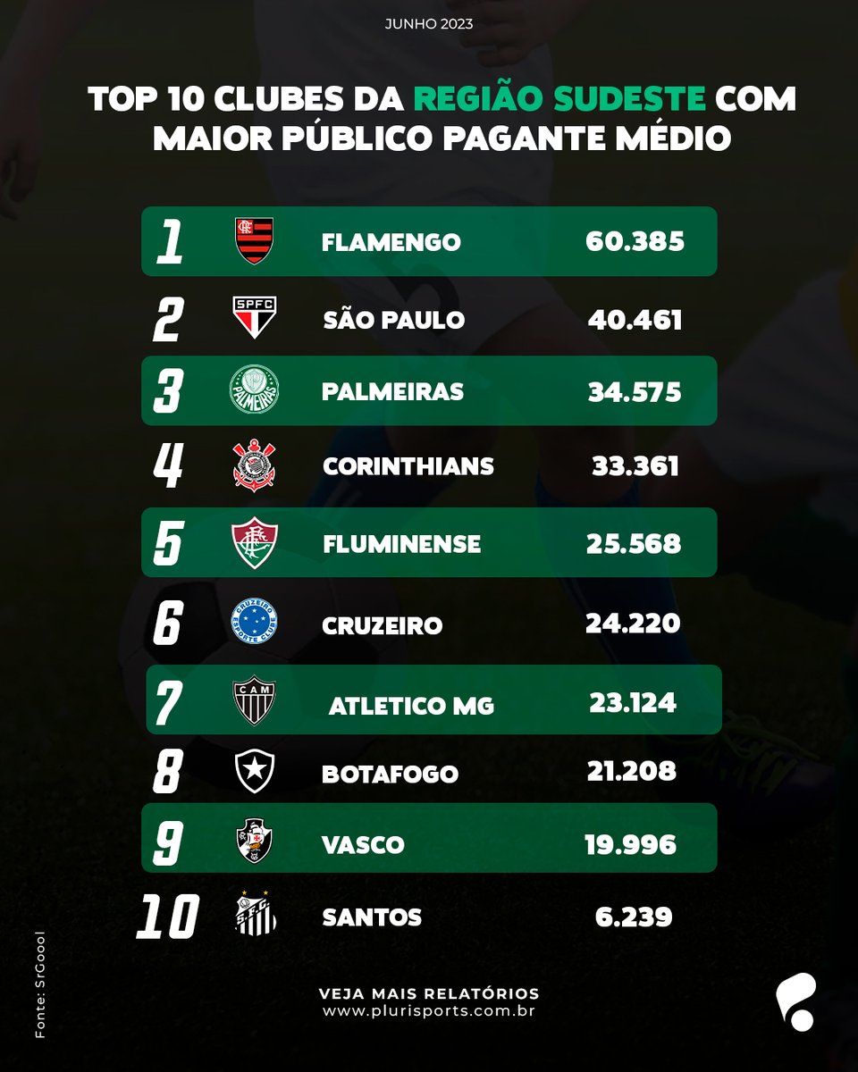 Flamengo com uma incrível média acima de 60 mil torcedores pagantes. São Paulo na segunda colocação com média acima de 40 mil pagantes.