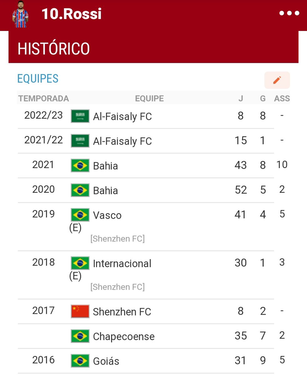 Números do ponta direita Rossi (30 anos) novo reforço do Vasco.