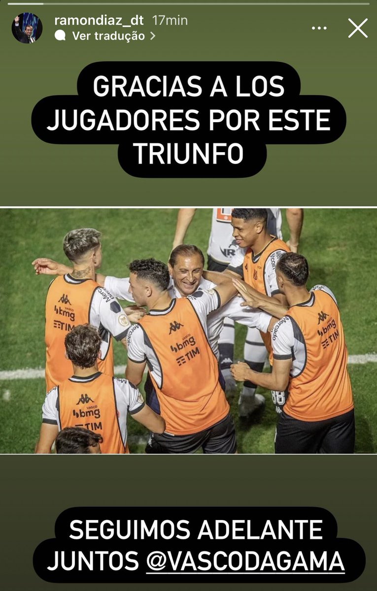 Ramón Díaz elogia os jogadores do Vasco em postagem no Instagram; veja