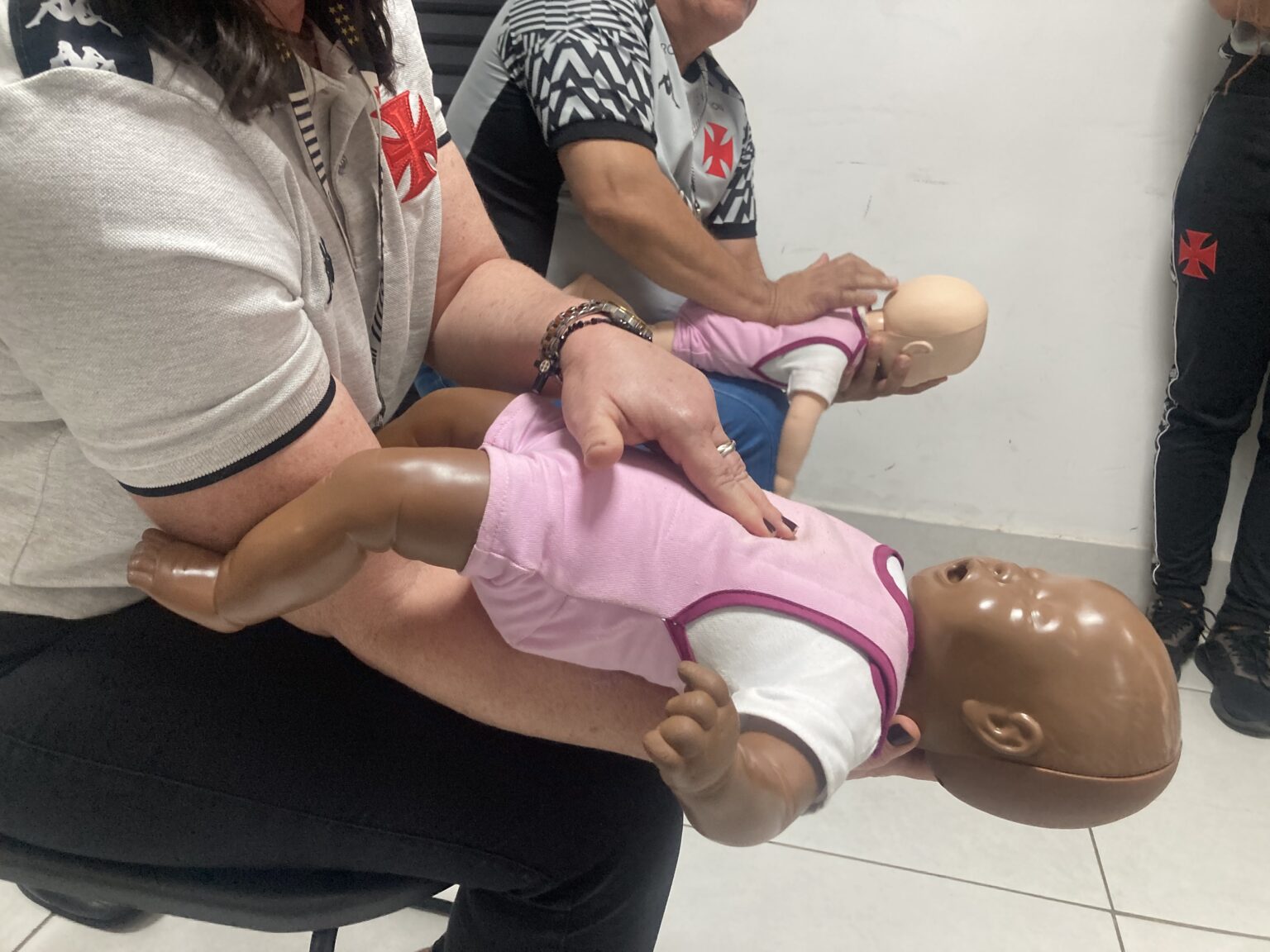 Além da aula teórica, os funcionários do Vasco também fizeram treinamento prático com as técnicas de massagem cardíaca para pessoas com parada cardiorrespiratória e técnicas de desengasgo para aqueles que tem suas vias aéreas obstruídas.