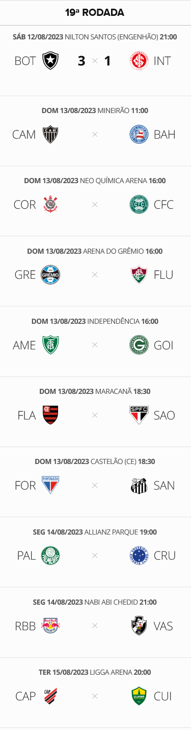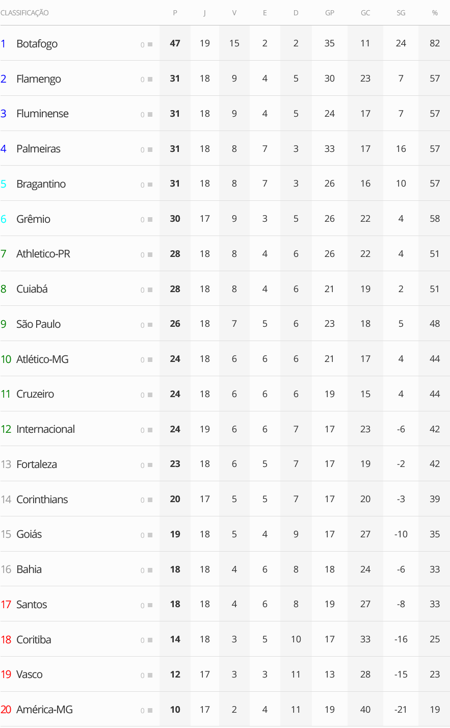 O jogo Botafogo 3 x 1 Internacional abriu a 19ª rodada do Campeonato Brasileiro e não alterou a posição do Vasco na tabela de classificação. O Gigante da Colina enfrenta o Red Bull Bragantino na segunda-feira, às 21h, no Nabi Abi Chedid.