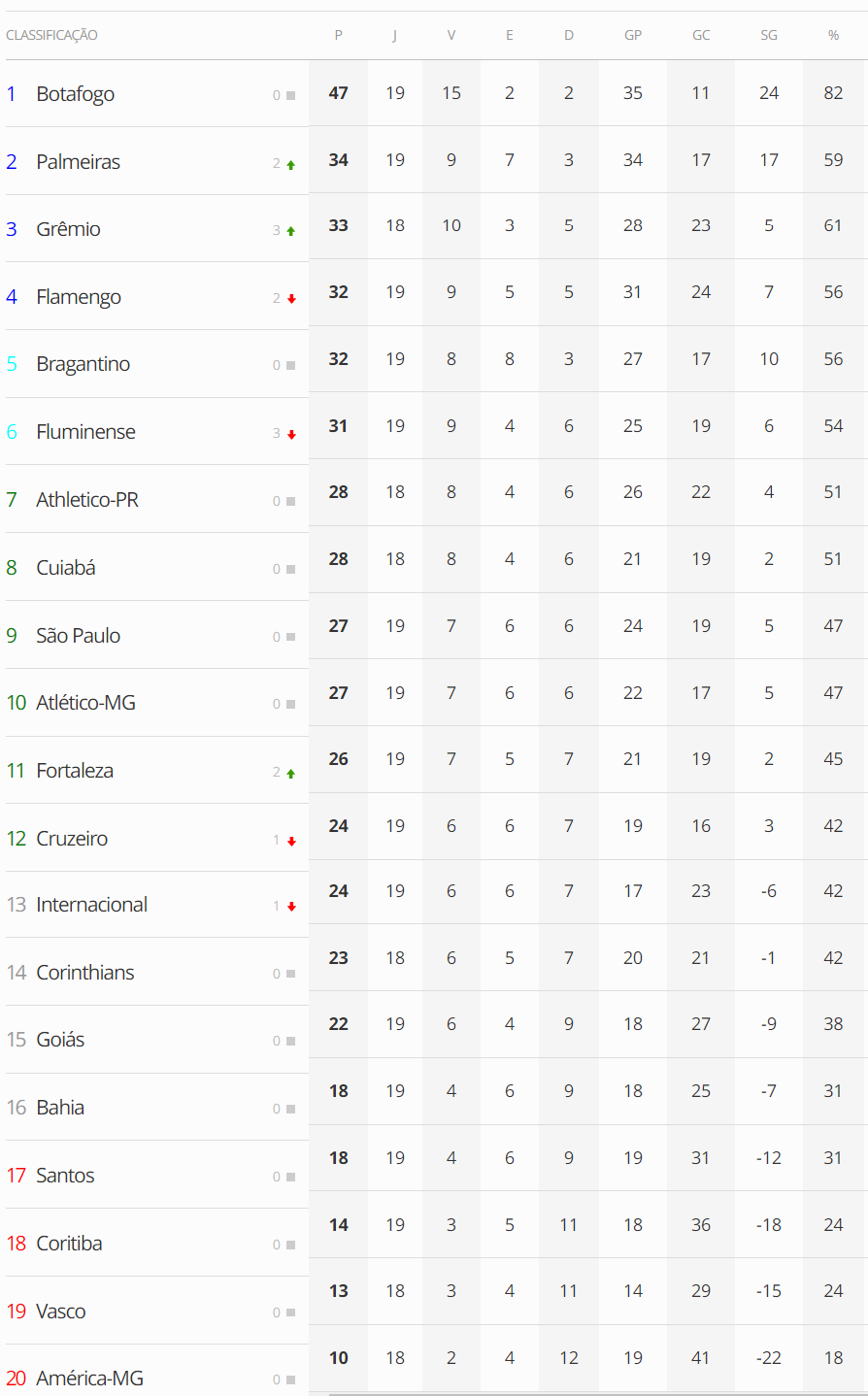 Após os jogos desta 2ª-feira pela 19ª rodada do Campeonato Brasileiro, o Vasco, que empatou com o Red Bull Bragantino por 1 a 1, segue na penúltima colocação. O Vasco tem um jogo a menos do que a maioria dos participantes, pois seu jogo contra o América-MG foi adiado.