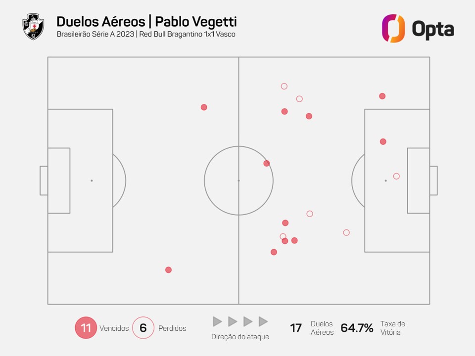 11 - Pablo Vegetti ganhou 11 duelos aéreos diante do Red Bull Bragantino, maior registro de um jogador do Vasco em uma partida do Brasileirão Série A desde, ao menos, 2013. Presença.