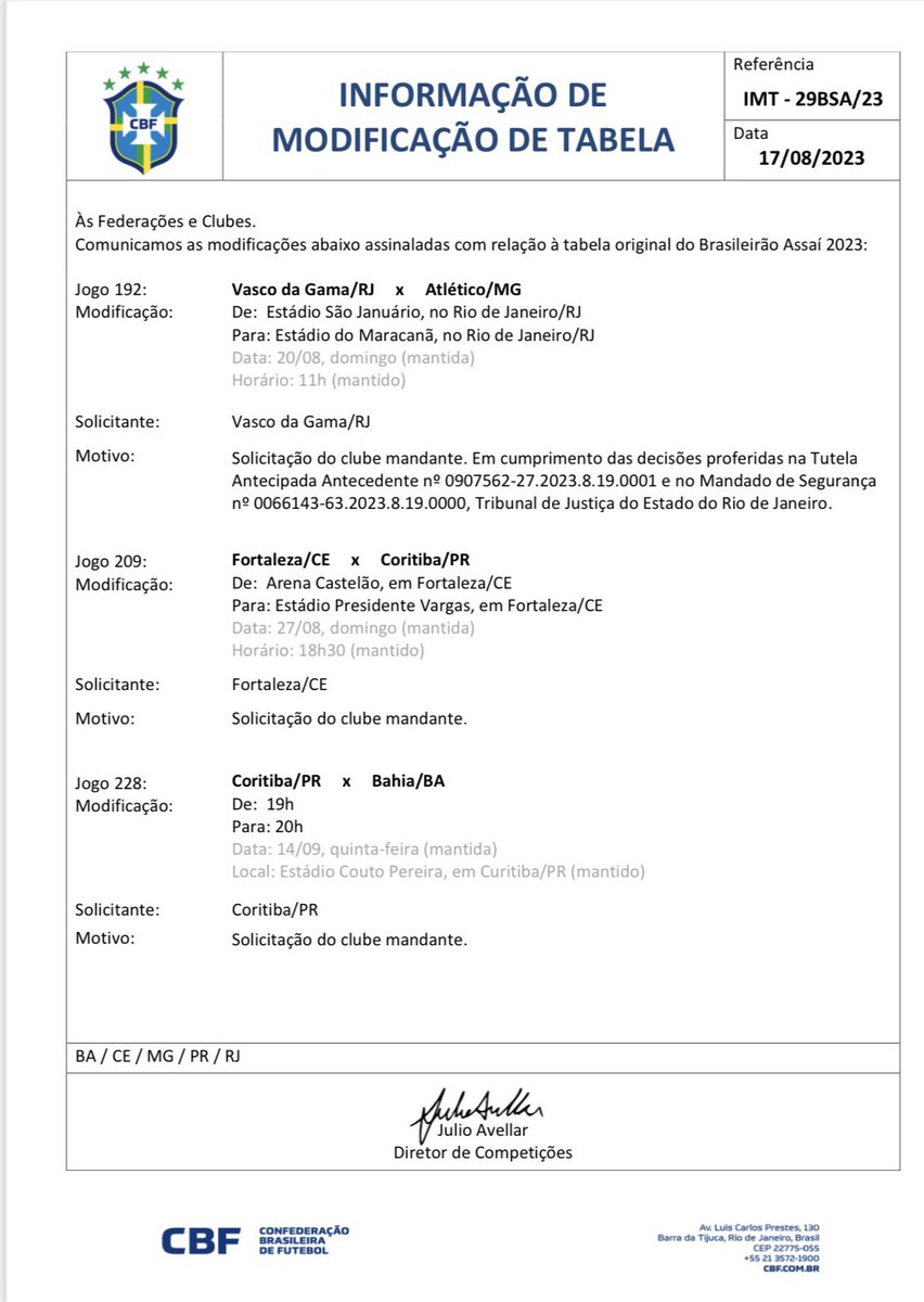 CBF oficializa mudança de Vasco x Atlético-MG para o Maracanã