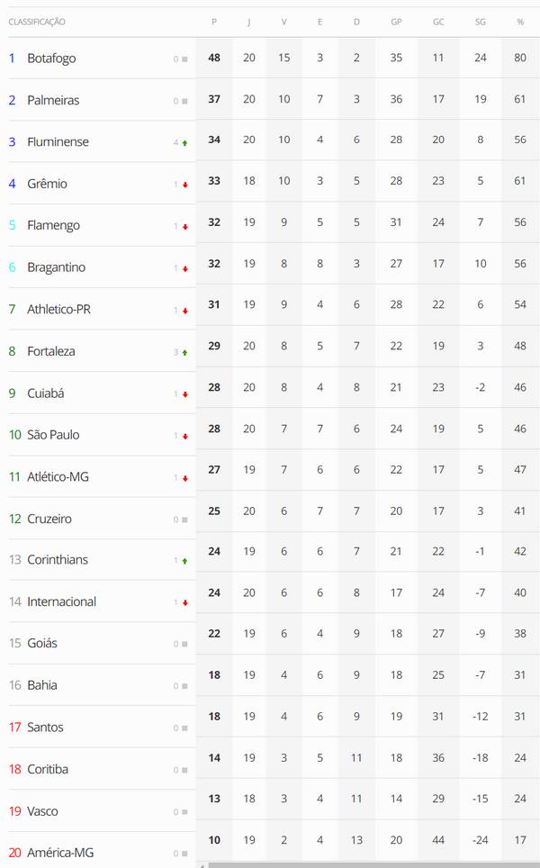 Veja a classificação do Brasileiro após os jogos de sábado; Vasco está na penúltima colocação