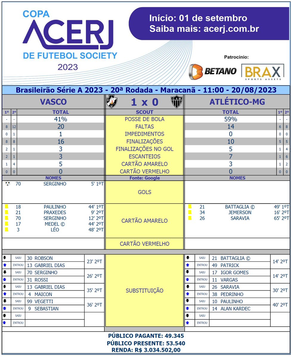 VASCO: Jardim; Robson (Dias, 22'/2ºT) (Maicon, 33'/2ºT), Medel, Léo e Piton; Zé Gabriel, Paulinho e Praxedes; Serginho (Rossi, 24'/2ºT), Vegetti (Ferreira, 33'/2ºT) e Pec. Técnico: Emiliano Diaz.