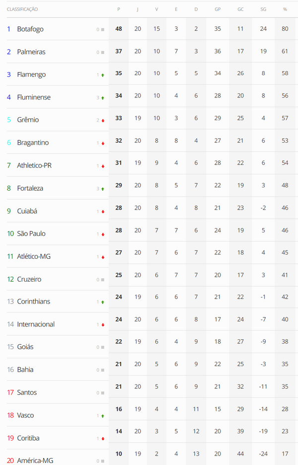 Após os jogos deste domingo pela 20ª rodada do Campeonato Brasileiro, o Vasco, que venceu o Atlético-MG neste domingo, sobe da penúltima para a 18ª colocação. O Vasco tem um jogo a menos do que a maioria dos participantes, pois seu jogo contra o América-MG foi adiado.