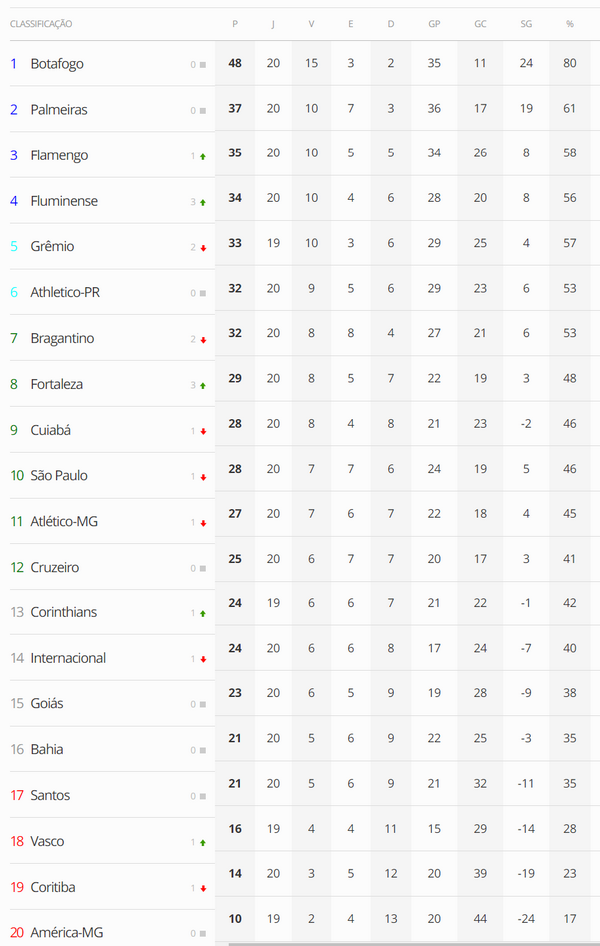 Ao final da 20ª rodada do Campeonato Brasileiro, o Vasco, que venceu o Atlético-MG por 1 a 0, subiu da 19ª para a 18ª colocação. A diferença para o 1º time fora do Z4, que é o Bahia, é de 5 pontos. O Vasco tem um jogo a menos do que a maioria dos participantes, pois seu jogo contra o América-MG foi adiado.