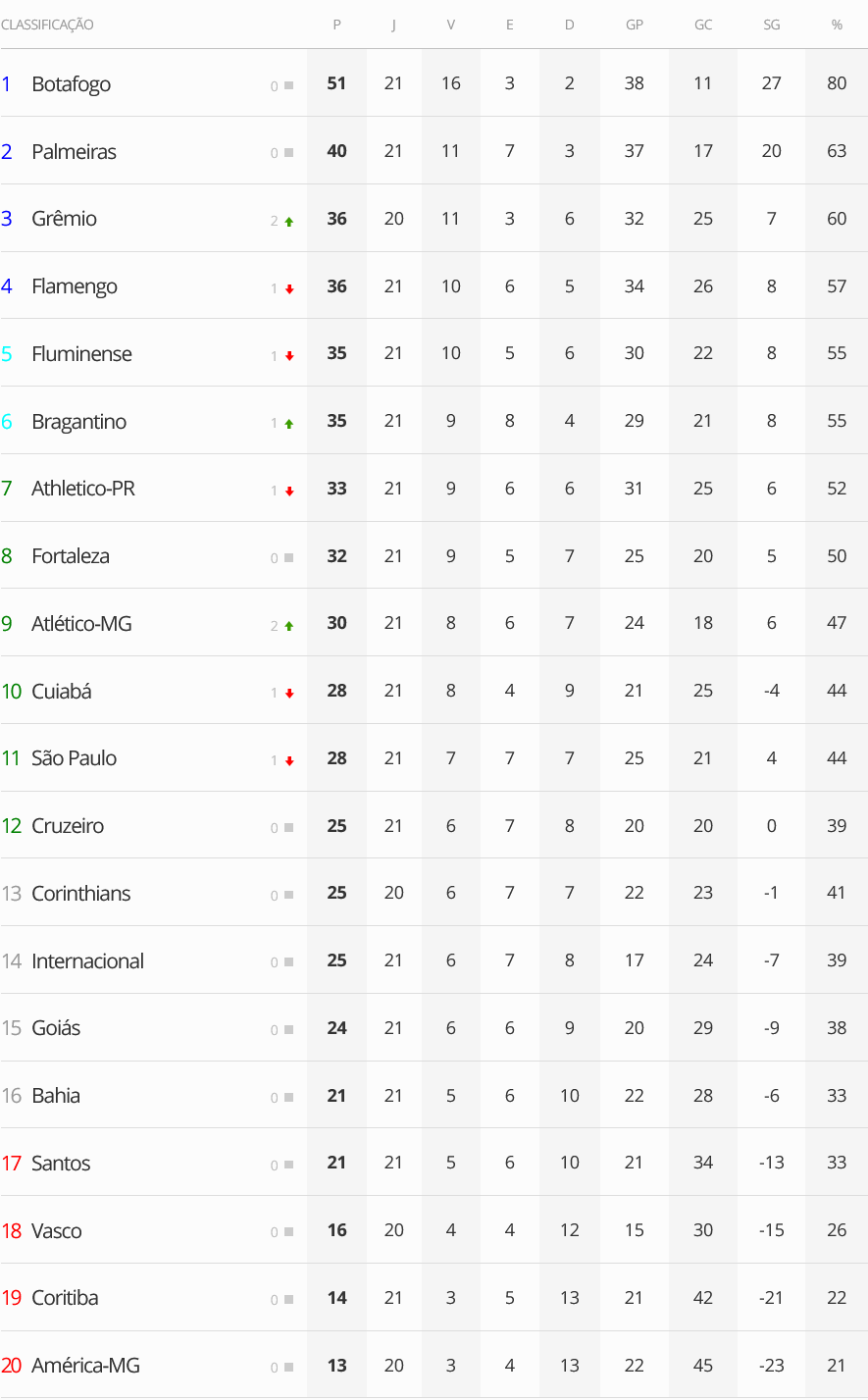 Ao final da 21ª rodada do Campeonato Brasileiro, o Vasco, que perdeu para o Palmeiras por 1 a 0, segue na 18ª colocação. A diferença para o 1º time fora do Z4, que é o Bahia, é de 5 pontos. O Vasco tem um jogo a menos do que a maioria dos participantes, pois seu jogo contra o América-MG foi adiado para 23/09.
