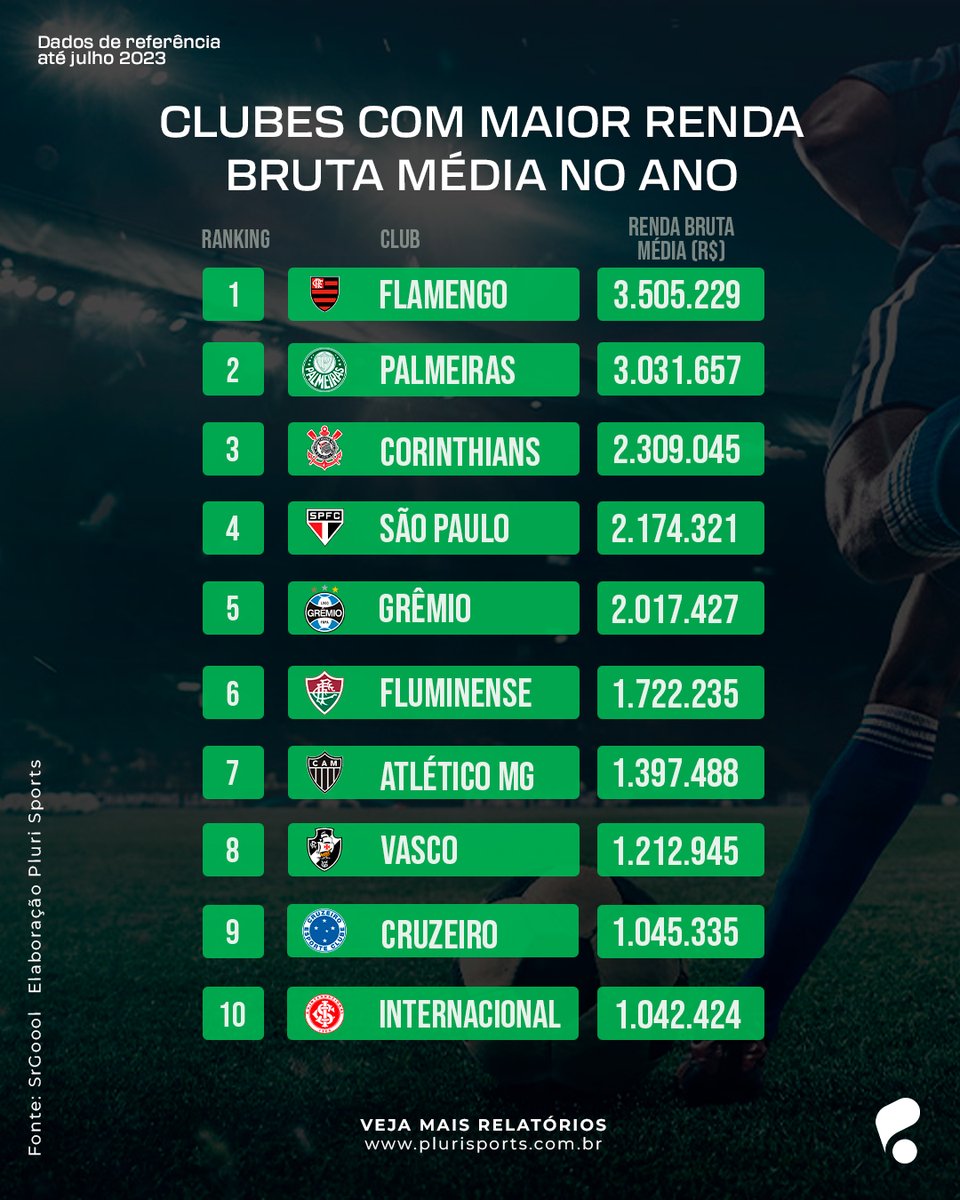 Após sete meses, 10 clubes já ultrapassaram a marca de R$1 milhão em renda bruta média arrecadada, com destaque para Flamengo e Palmeiras que atingiram valores superiores a R$3 milhões.