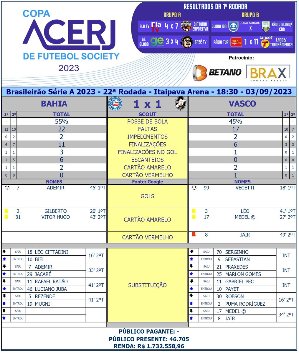 Cartões amarelos: Gilberto e Victor Hugo (BAH); Léo e Medel (VAS)
