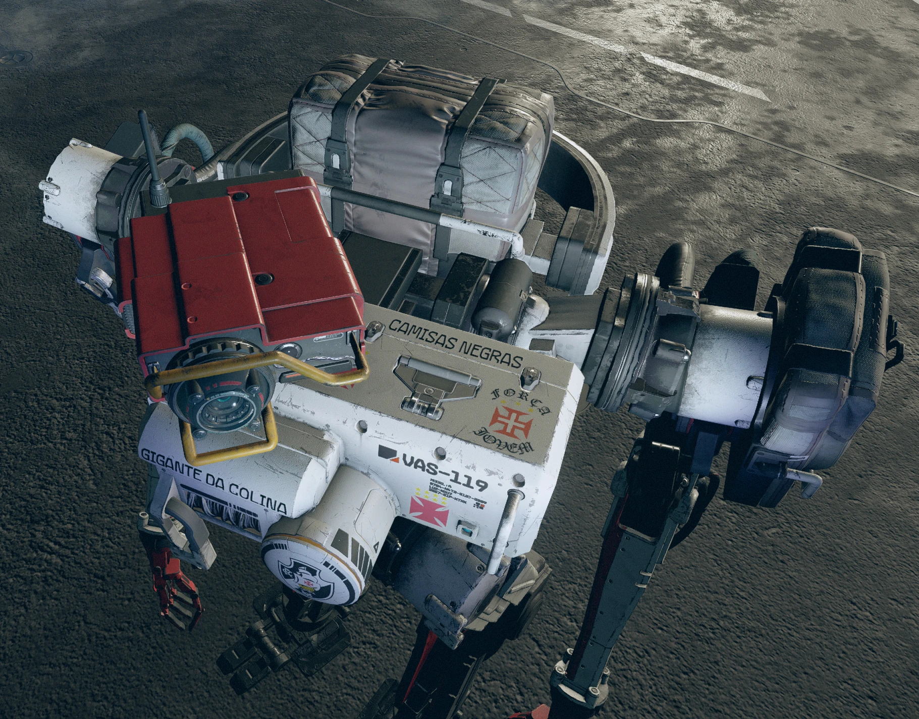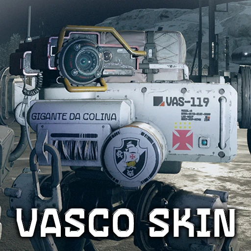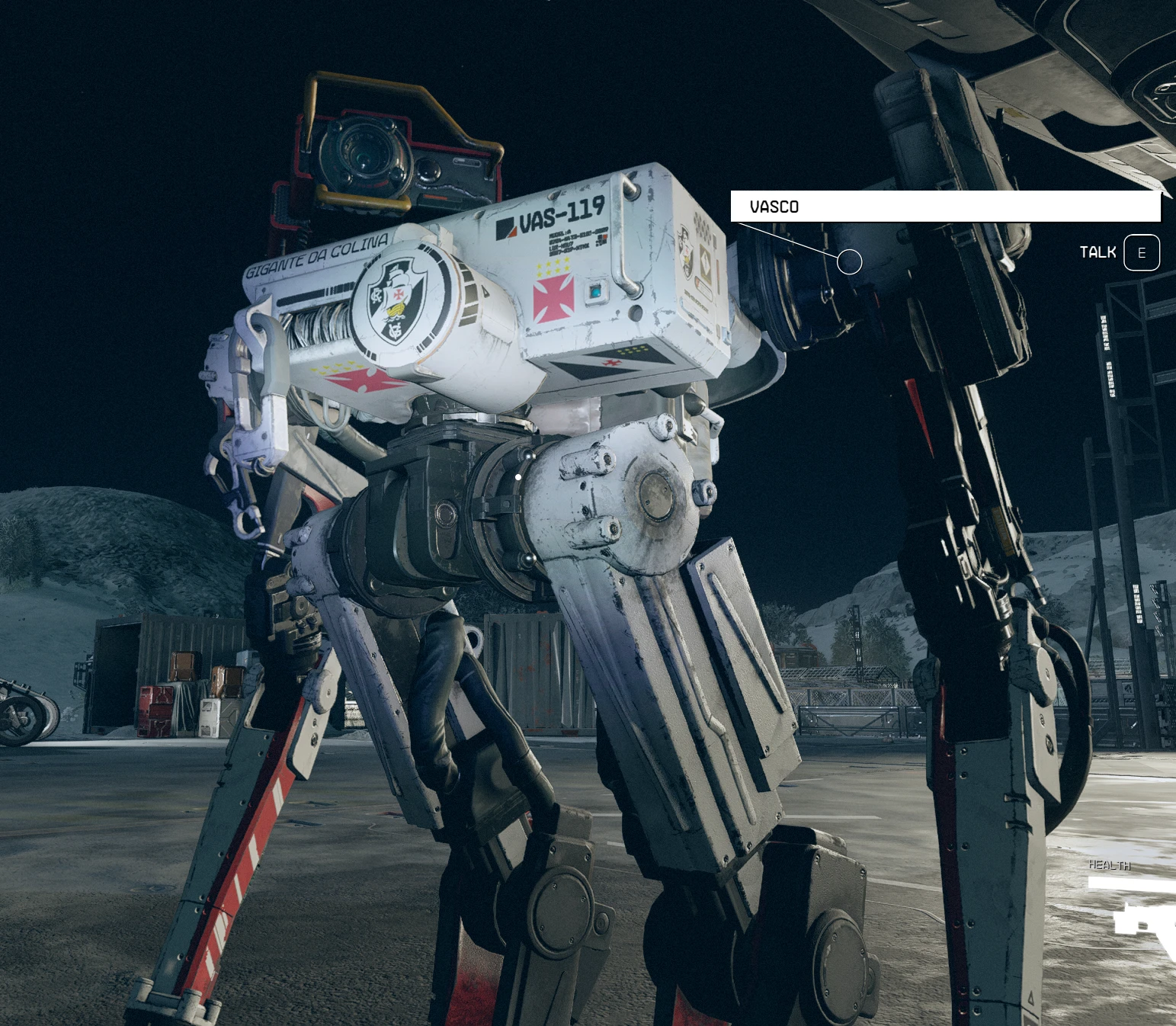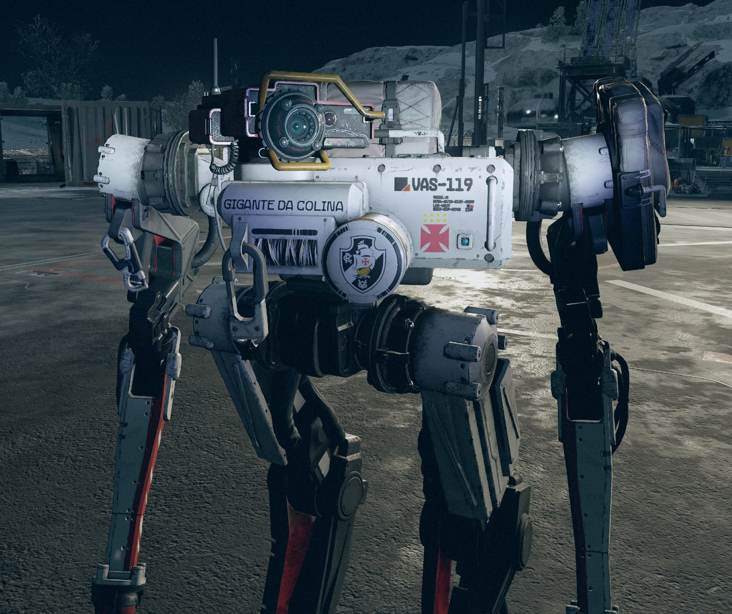 Simplesmente o Gigante da Colina. Um mod, disponível na plataforma Nexus Mods, colocou o escudo do clube de futebol brasileiro Club de Regatas Vasco da Gama no robô Vasco, de Starfield.