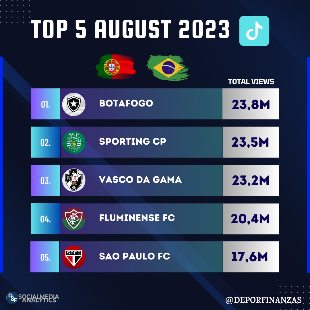 📲⚽⏯🎶 Os 5 clubes dos países de lingua portuguesa com mais visualizações no #TikTok durante agosto 2023!