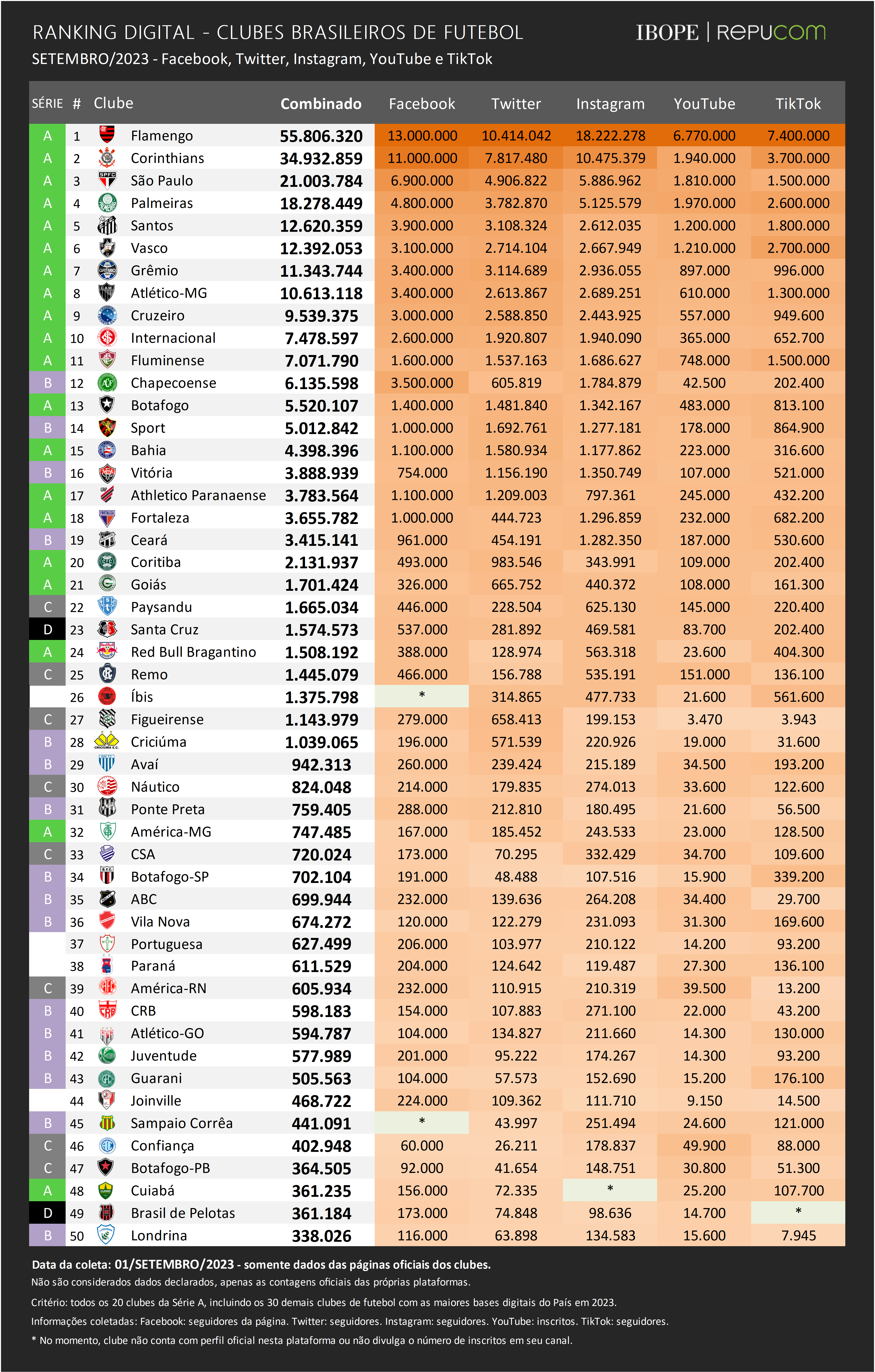 Na edição deste mês do Ranking Digital dos Clubes Brasileiros, o IBOPE Repucom destaca o desempenho mensal no volume de novos inscritos nas redes sociais dos clubes em agosto de 2023. Os 50 clubes considerados no estudo acumularam um total de 2,5 milhões de seguidores durante o período, e os cinco que mais se destacaram foram: São Paulo, Corinthians, Fluminense, Flamengo e Botafogo. Juntos, foram responsáveis por cerca de 1,8 milhão de novas inscrições, ou 72% do total entre todos os 50 clubes no período.