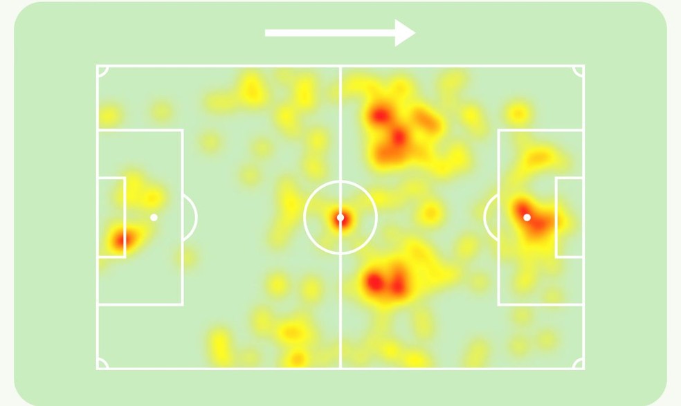 Apesar de gostar muito da área, Vegetti também frequenta bem as outras regiões do campo, especialmente no ataque, dando opção para puxar contragolpe, fazer tabelas e atrair a marcação para abrir espaço (veja o mapa de calor abaixo). No alto, o centroavante do Vasco venceu mais da metade dos duelos feitos até aqui (55%).