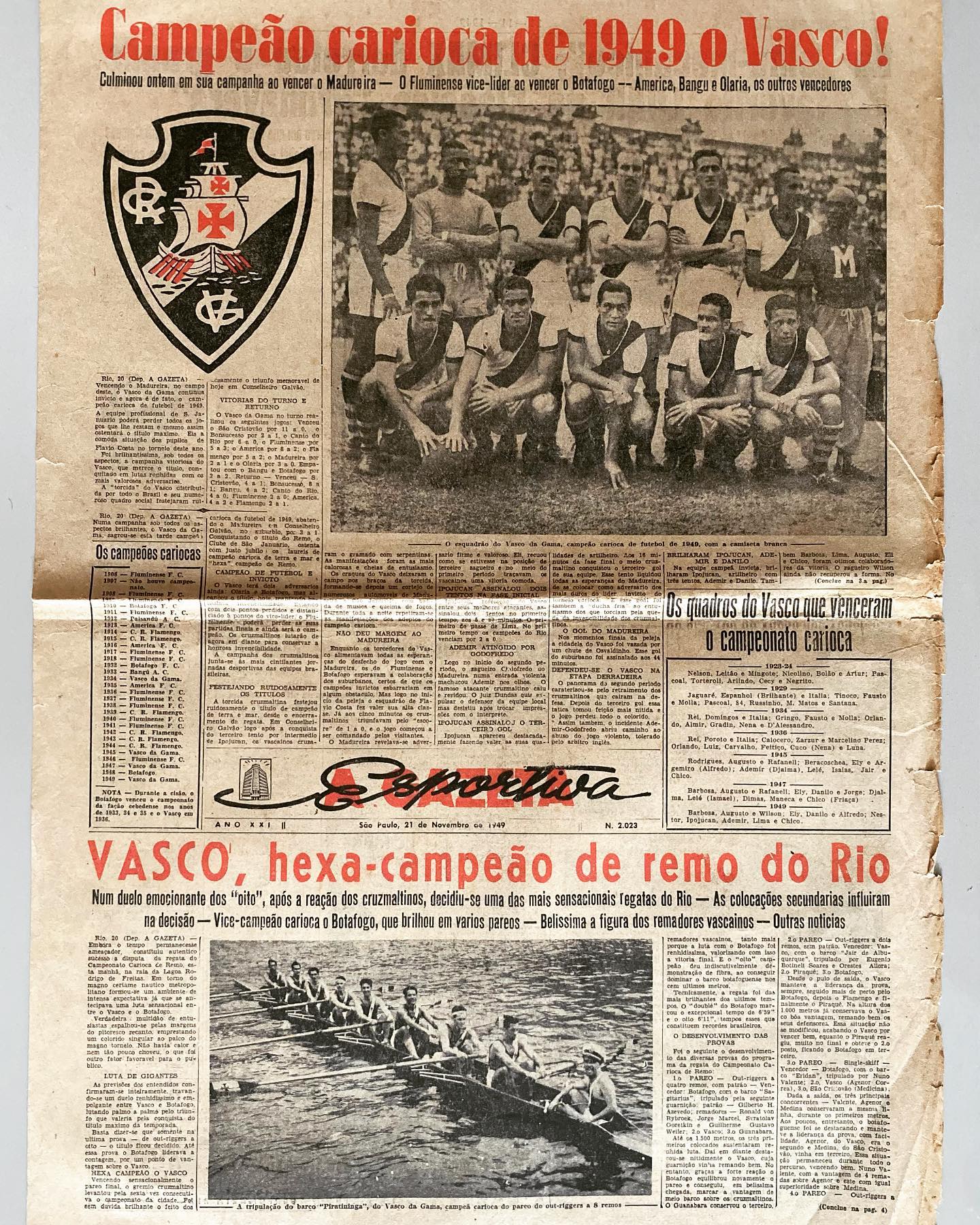 Veja página de jornal de 1949 destacando títulos cariocas do Vasco no Futebol e no Remo