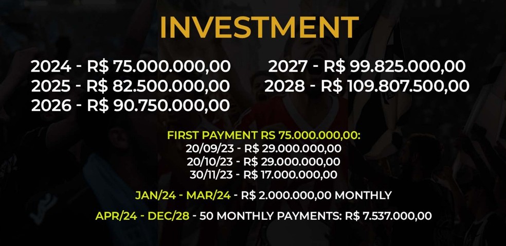 Cada cota de patrocínio estipulada pela Brax tem a pretensão de arrecadar R$ 458 milhões, divididos em parcelas entre 2024 e 2028.