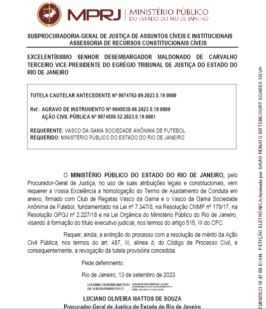 Ministério Público do RJ apresentou nos autos do processo que interditou o Estádio de SJ o TAC assinado pelo Vasco e requerendo a homologação e a extinção do processo.