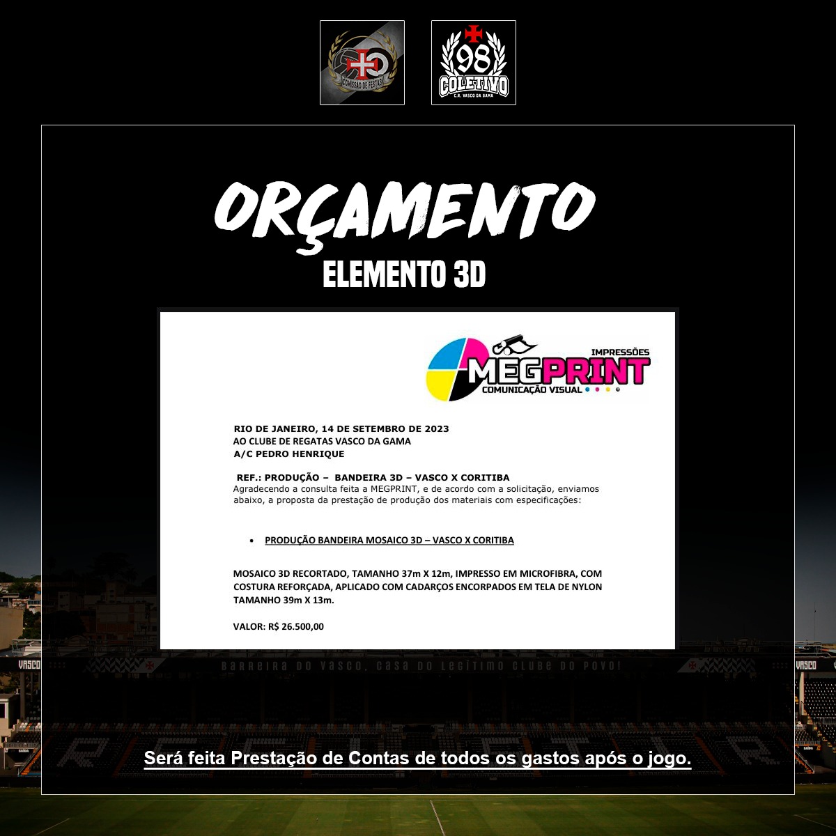 Dando início ao processo de transparência, segue o orçamento somente para o elemento 3D, que terá 444 m². Além disso, teremos custos para montar a estrutura que suspenderá o 3D. Isso inclui cordas, barras de aluminio, roldanas, entre outros materiais, (+)