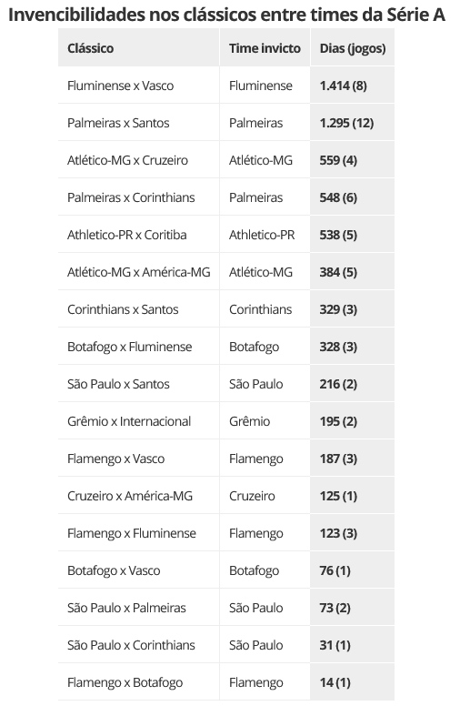 O clássico deste sábado colocará à prova a invencibilidade mais longa em clássicos entre clubes da primeira divisão do Campeonato Brasileiro. O Fluminense não perde para o Vasco há 1.414 dias. Ou seja, desde 2 de novembro de 2019, quando as equipes empataram em 0 a 0, pela 30ª rodada do Brasileirão daquele ano.