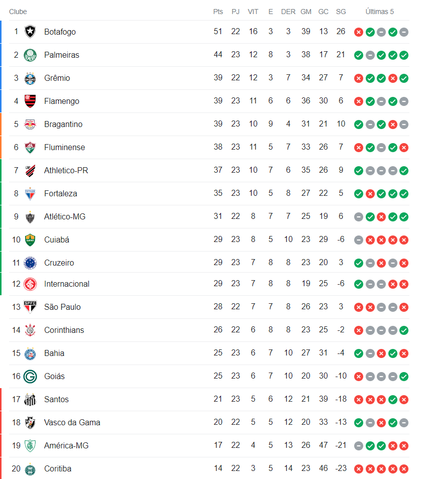 A 23ª rodada se encerra neste sábado com o jogo Atlético-MG x Botafogo, que começa às 21h.