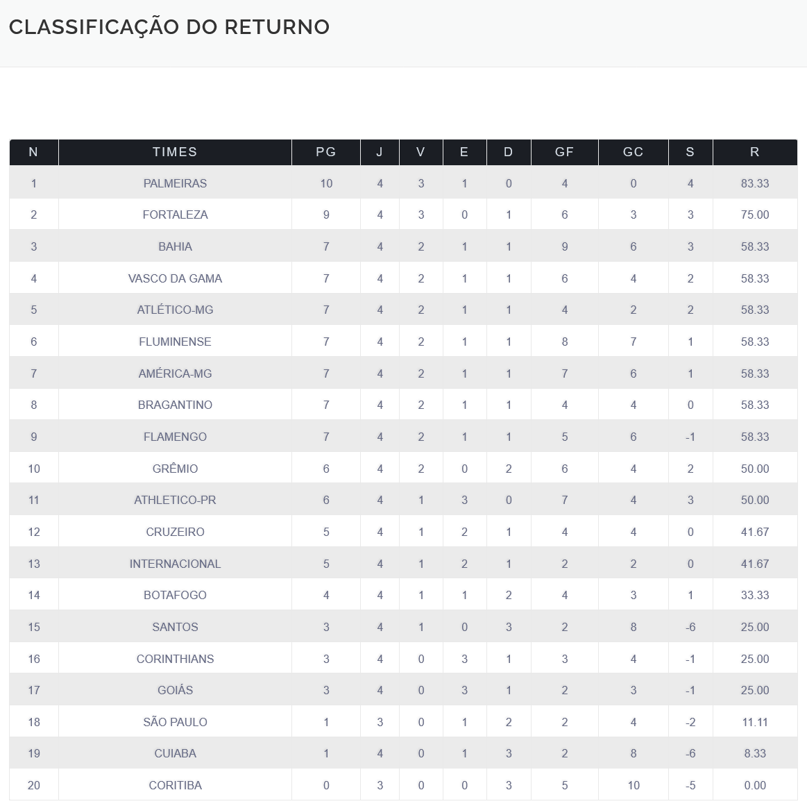 Com 7 pontos em 4 jogos, e vantagem no critério de desempate sobre todos os times com a mesma pontuação, exceto o Bahia, o Vasco tem a 4ª melhor campanha do returno do Campeonato Brasileiro.