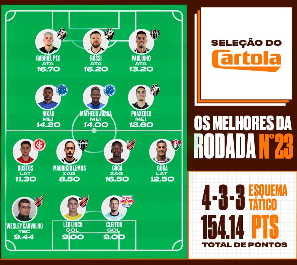 Vascaínos dominam a seleção da 23ª rodada do Brasileiro do Cartola; confira