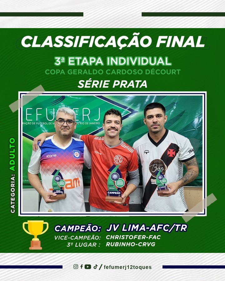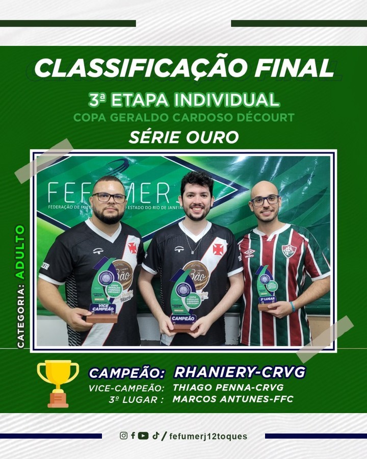 A Copa Geraldo Cardoso Décourt de Futebol de Mesa, equivalente à 3ª Etapa do Estadual, foi disputada neste fim de semana, dias 16 e 17 de setembro, na sede do Botafogo Futmesa, com a disputa das categorias máster (acima de 48 anos) e adulto, respectivamente. Os grandes campeões foram o rubro-negro Armando Amêndola e o cruzmaltino Rhaniery Jardim, respectivamente. Estiveram presentes atletas de oito clubes: America, America de Três Rios, Duque de Caxias, Flamengo, Fluminense, Friburguense, Liga Campista e Vasco da Gama.
