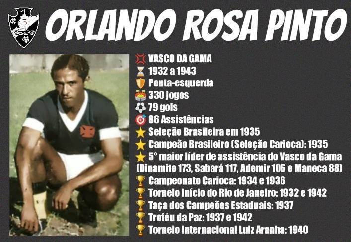 (20/9/1911) Nascia o Lendário Orlando Rosa Pinto, ídolo do Vasco entre as décadas de 30/40 e família de campeões em São Januário; seu Irmão Jair Rosa Pinto (Carioca 45) e o sobrinho Roberto Pinto (Carioca 56/58 e Rio São Paulo 58).