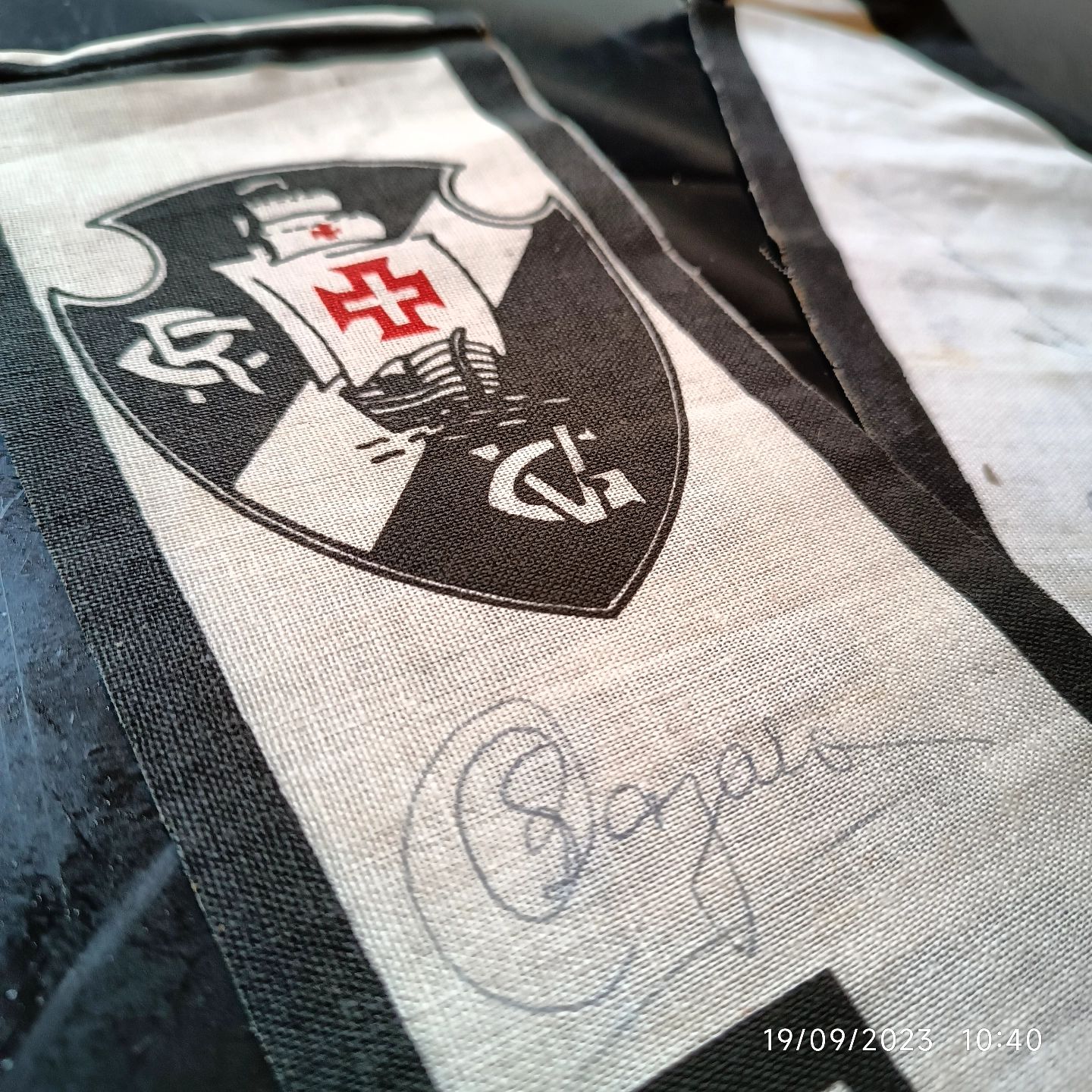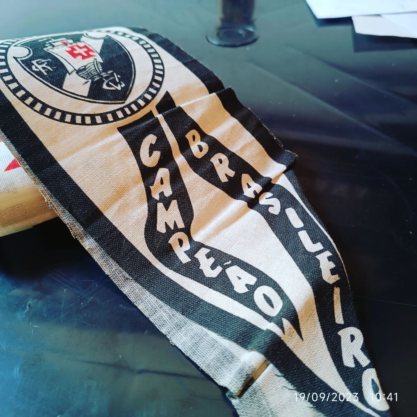 Colecionador mostra flâmulas dos títulos cariocas de 1947 e 1956 e faixa do Brasileiro de 1989