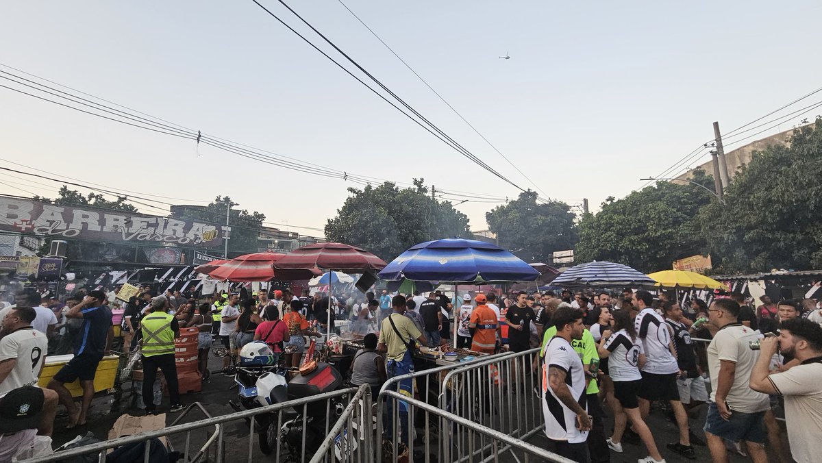 Fiscalização contra ambulantes aumentou aqui nos arredores de São Januário. Os vendedores não podem passar dessa barreira perto da praça da UPP.