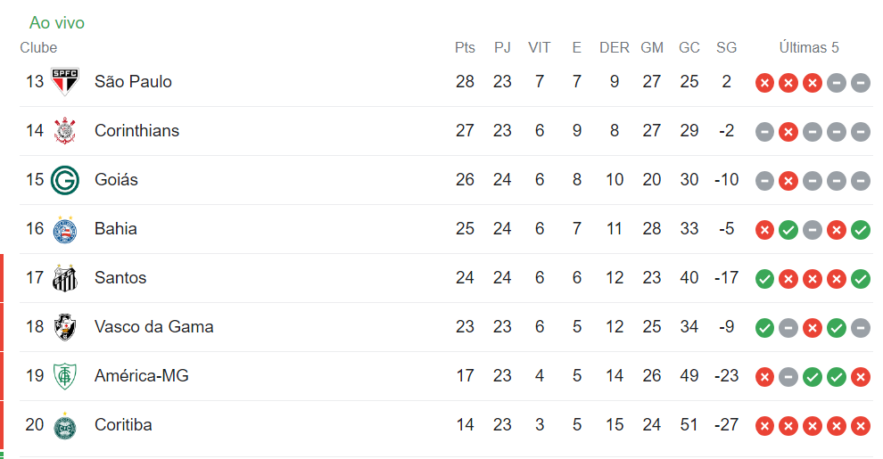 Com a vitória desta 5ª-feira sobre o Coritiba, o Vasco está a uma vitória (no jogo da próxima 2ª-feira, contra o América-MG) de deixar a zona do rebaixamento.