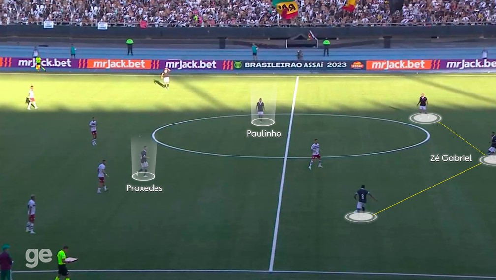 A saída de três é um padrão de Ramón Díaz porque ele treina e todos executam. Aconteceu também contra o Flu: Zé vindo buscar a bola lá de trás, Praxedes e Paulinho ocupando espaços na frente dessa linha de três e o resto do time esperando a bola no ataque, pronto para chegar ao gol. O Vasco consegue ter mais volume de jogo ataca de forma direta e rápida com esse jeito de construir.