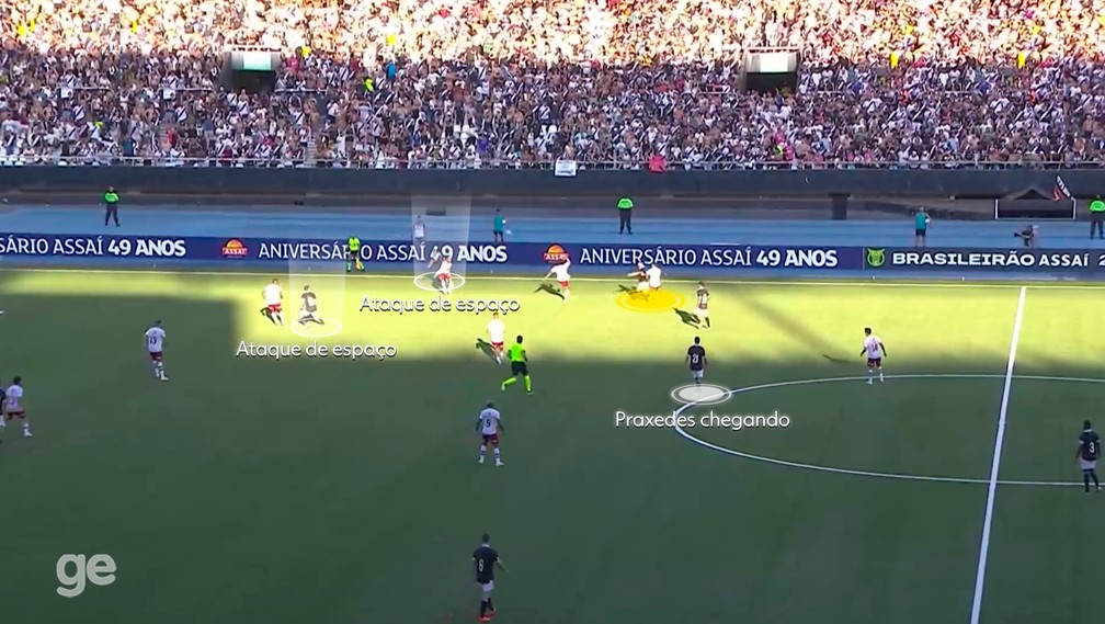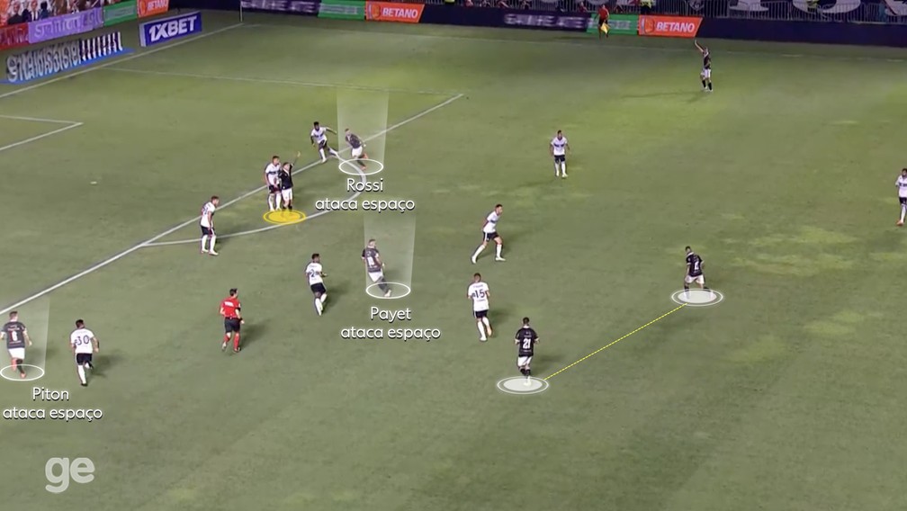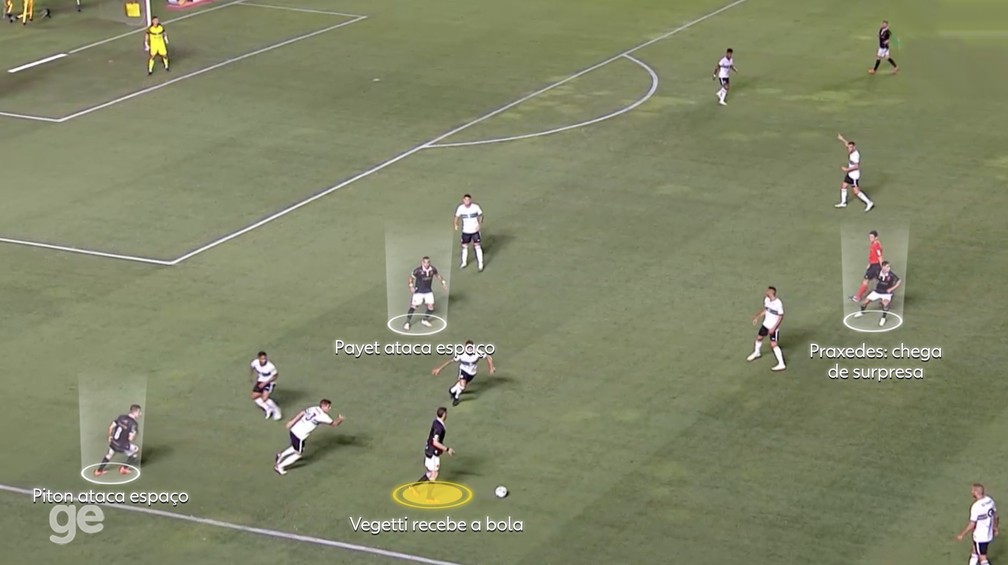 O ataque de espaço serve para a chegada lateral e também no ataque. Quando chega no chamado terço final, todo mundo precisa correr para frente e receber no espaço, nas costas da defesa adversária. Seja pelos lados ou por dentro, com Praxedes chegando bastante no ataque.