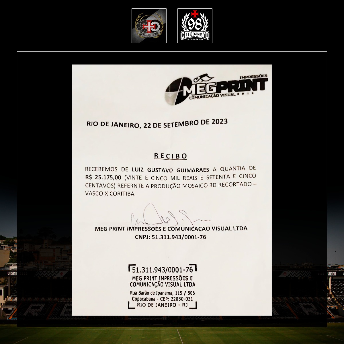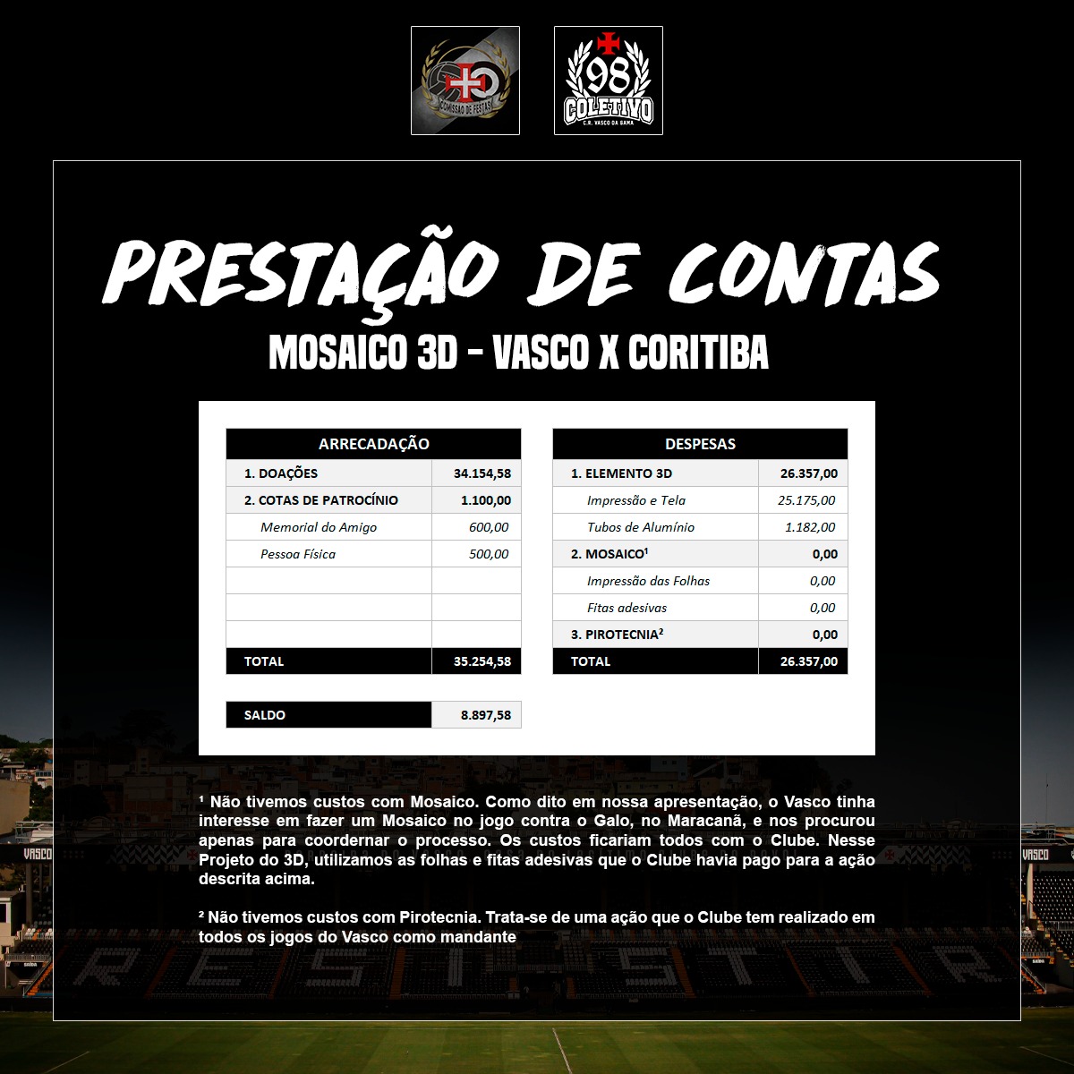 Conforme prometido, segue a prestação de contas de toda movimentação financeira envolvida no projeto do Primeiro Mosaico 3D no jogo contra o Coxa.