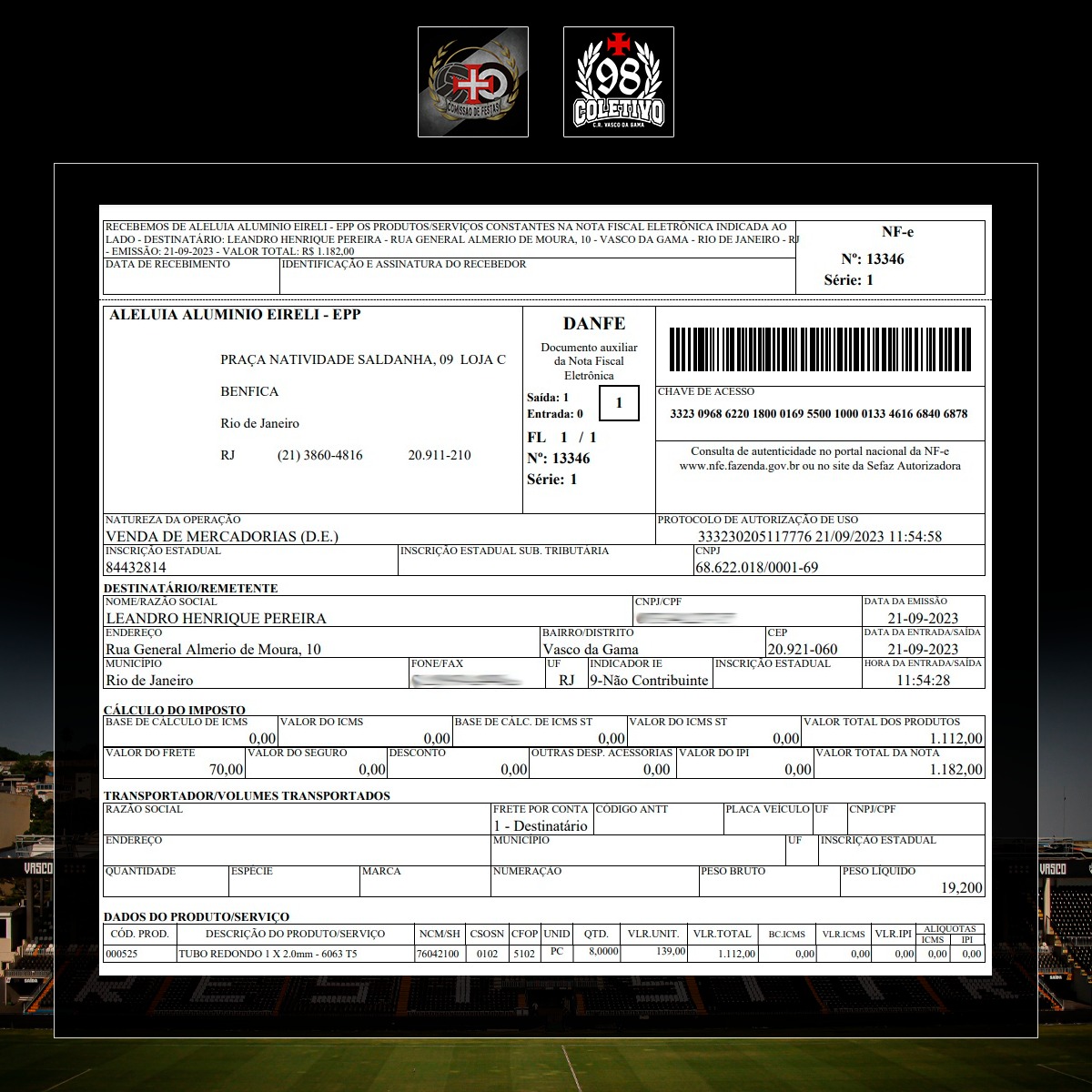 Imagem 2: Nota Fiscal do pagamento dos Tubos de Alumínio, no valor de R$ 1.182,00