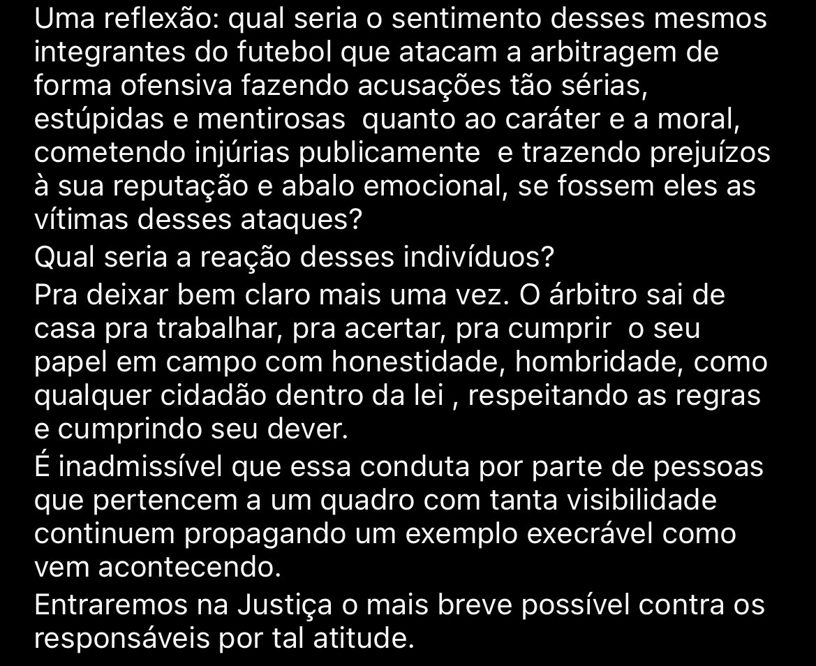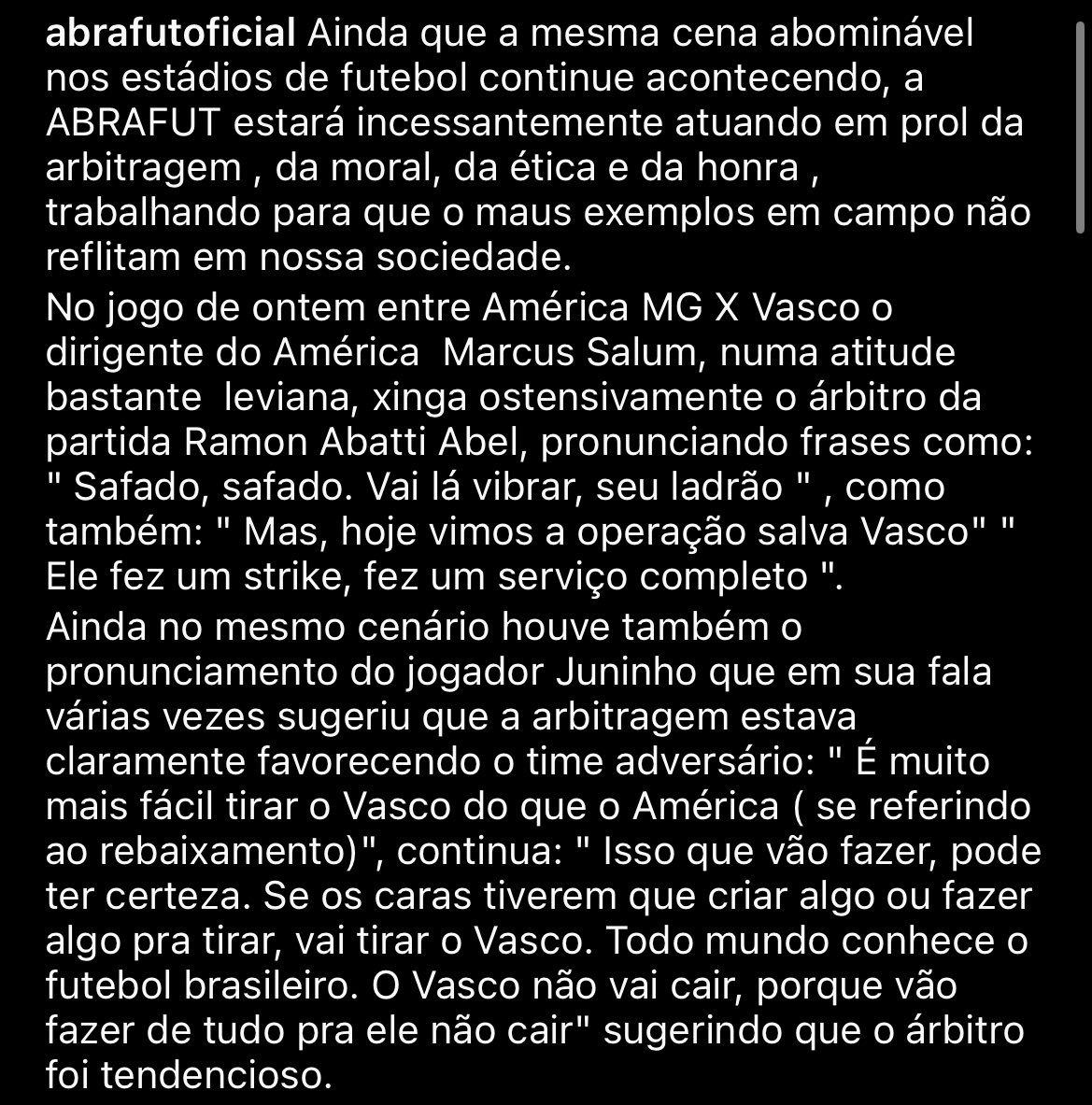 A Associação de Árbitros de Futebol do Brasil (ABRAFUT) garantiu que entrará na Justiça contra Juninho e Marcus Salum, jogador e presidente do América-MG, respectivamente.