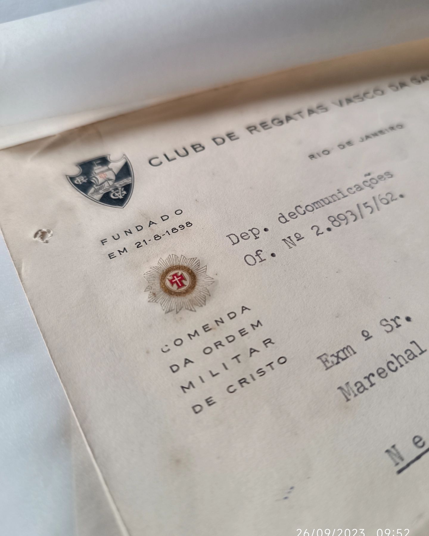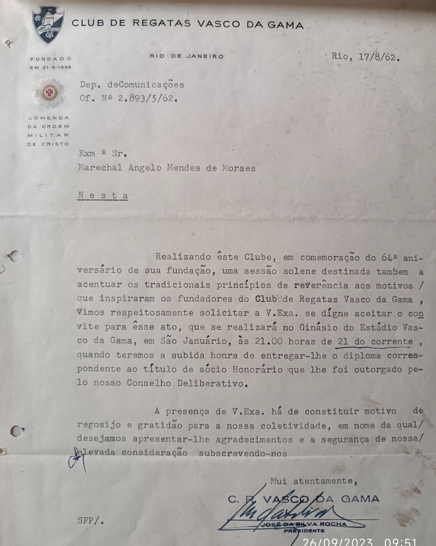Ofício do Dep.de Comunicações do CRVG datado de 17/08/1962 ao Exm° Sr. Marechal Ângelo de Moraes, convidando-o para 64° aniversário da fundação do clube, aonde na ocasião foi concedido o título de sócio honorário.