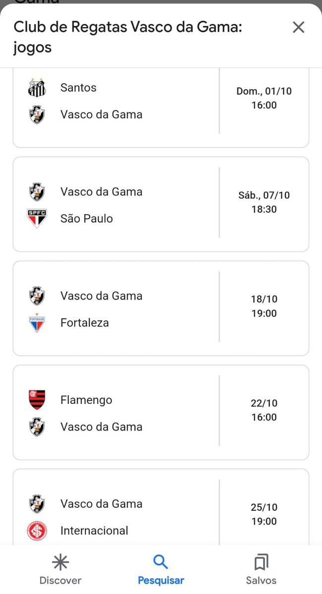 Após o jogo contra o Santos, no próximo domingo (01/10), o Vasco terá uma sequência de quatro jogos no Rio de Janeiro: São Paulo, Fortaleza, Flamengo e Internacional.