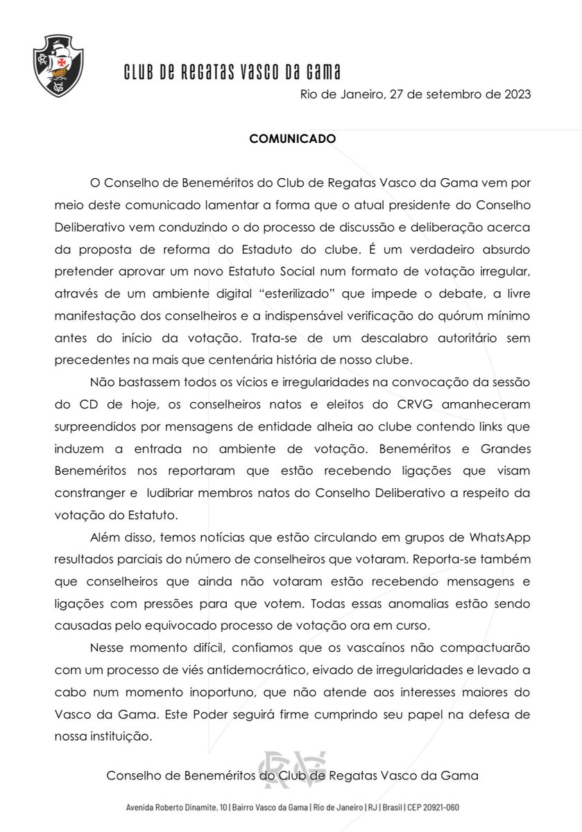 Conselho de Beneméritos divulga comunicado repudiando a forma como o Conselho Deliberativo conduziu a votação sobre a reforma do estatuto do Vasco.