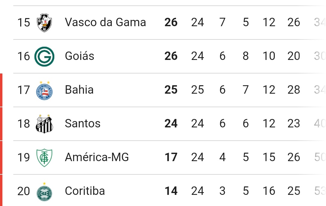 Com a derrota do Bahia para o Flamengo, a classificação ficou assim.