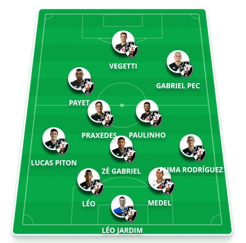 Provável escalação: Léo Jardim, Puma, Medel, Léo, Lucas Piton, Zé Gabriel, Praxedes, Paulinho, Payet (Marlon Gomes), Gabriel Pec e Vegetti.